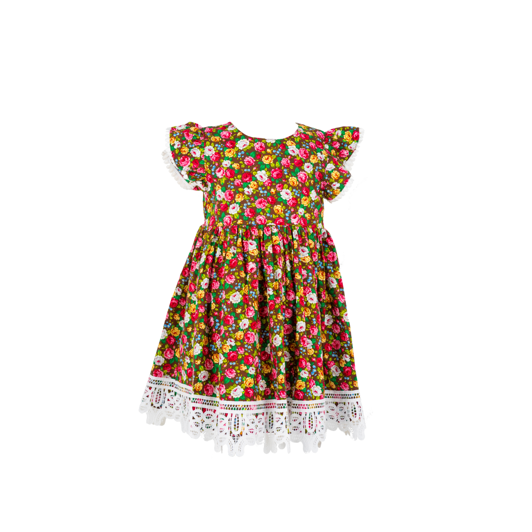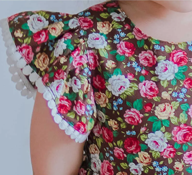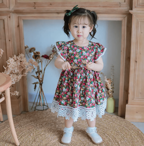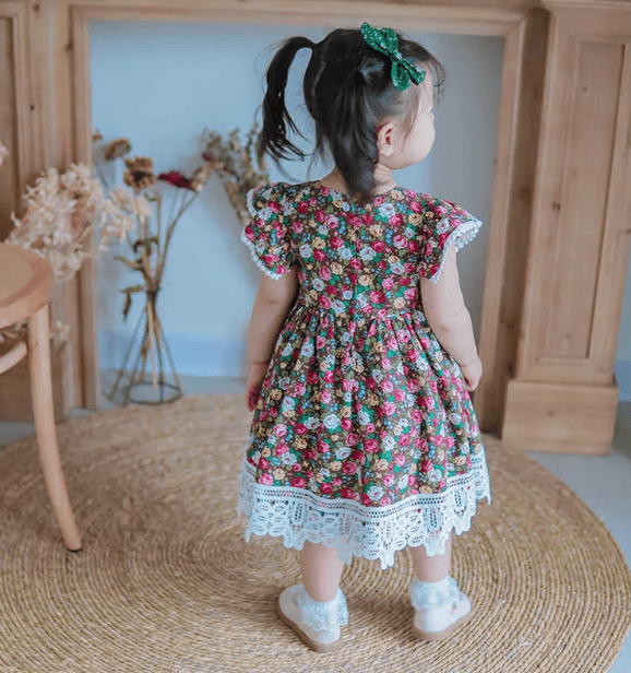 Our beautiful Amelia floral dress in Black, a classic piece for your toddlers! It is made of comfortable cotton fabric and is fully lined with cotton lining. It features a beautiful hemline, comes with flat pompoms on its flutter sleeve and is finished with buttons at the back.