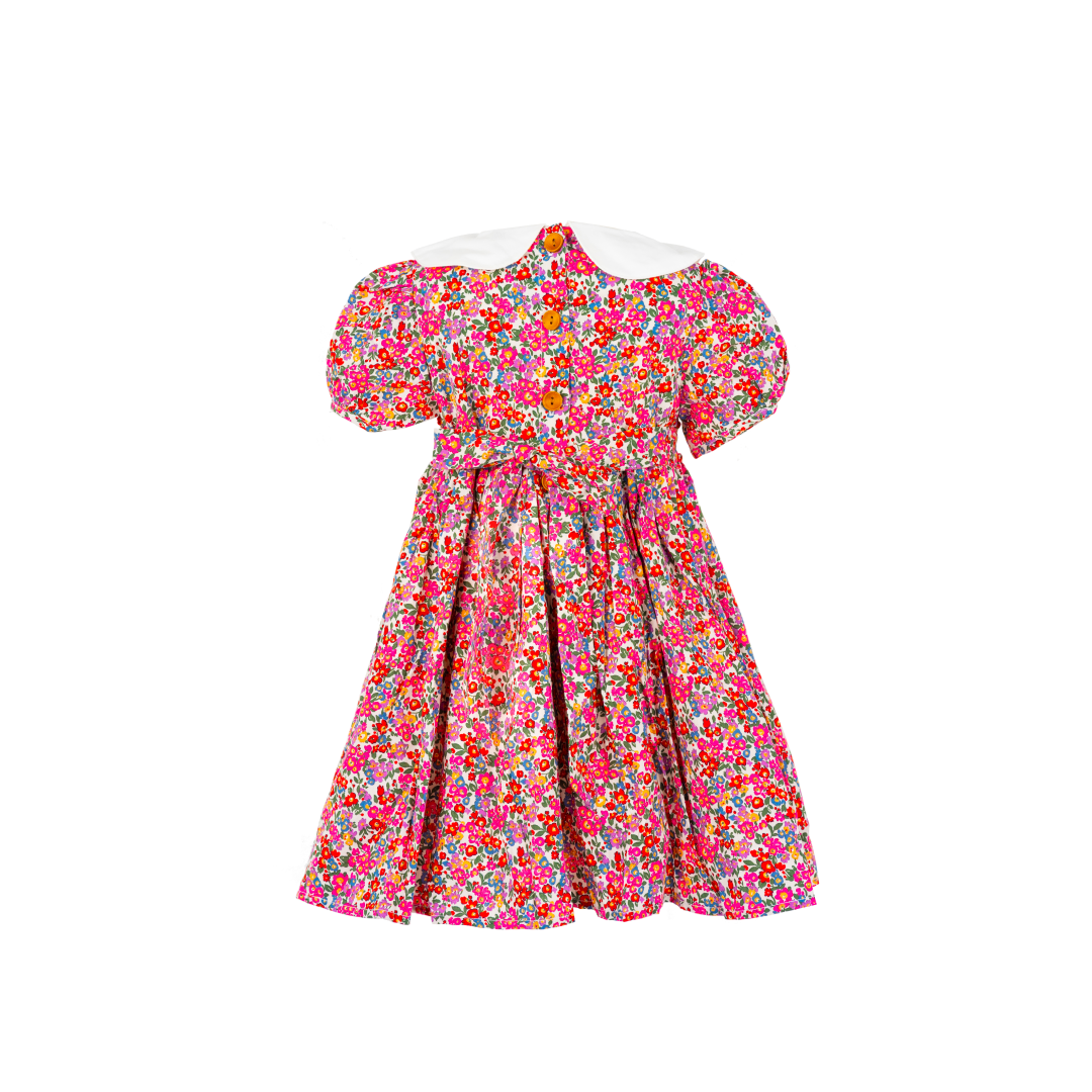 Our Charlotte Smocked made from cotton fabric is a classic design which features an embroidery across the bodice giving this dress its traditional look. It has a Peter Pan collar with floral needlework, slightly puff sleeves, fully lined and a tea-length silhouette. If it finished with the buttons at the back and a sash that is tied as a bow for a decorative finishing touch.