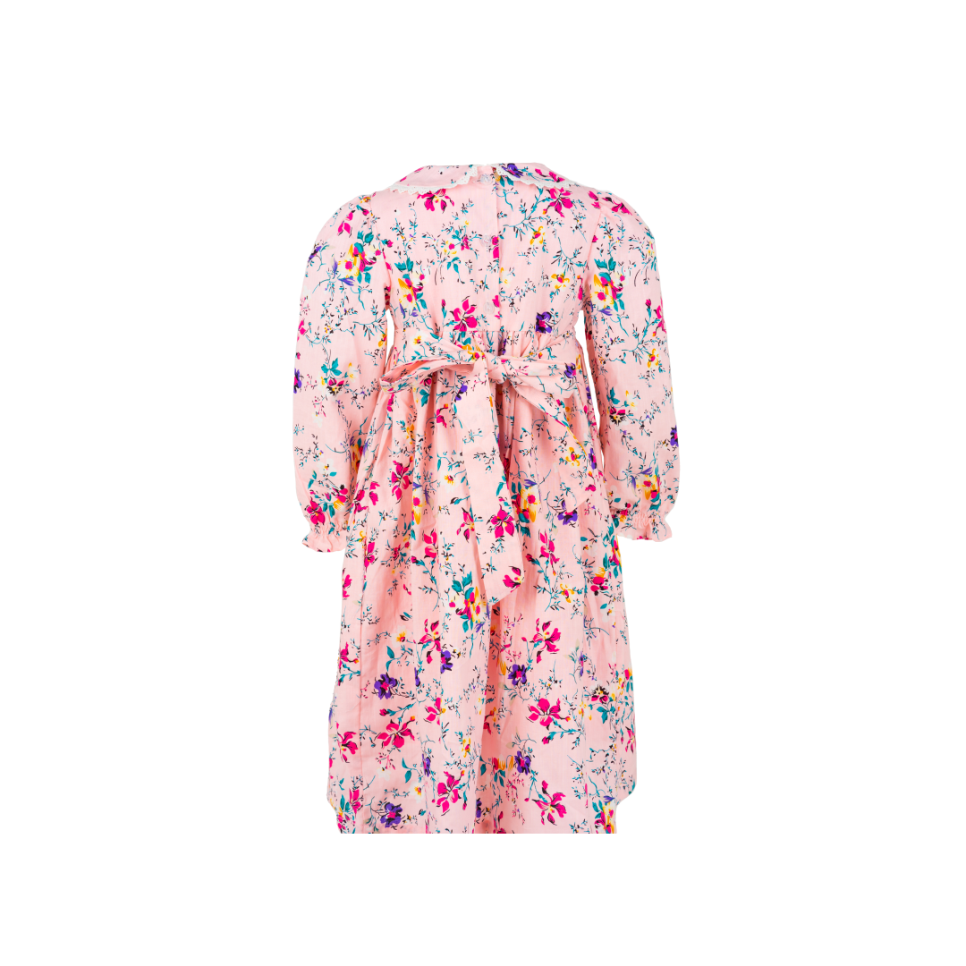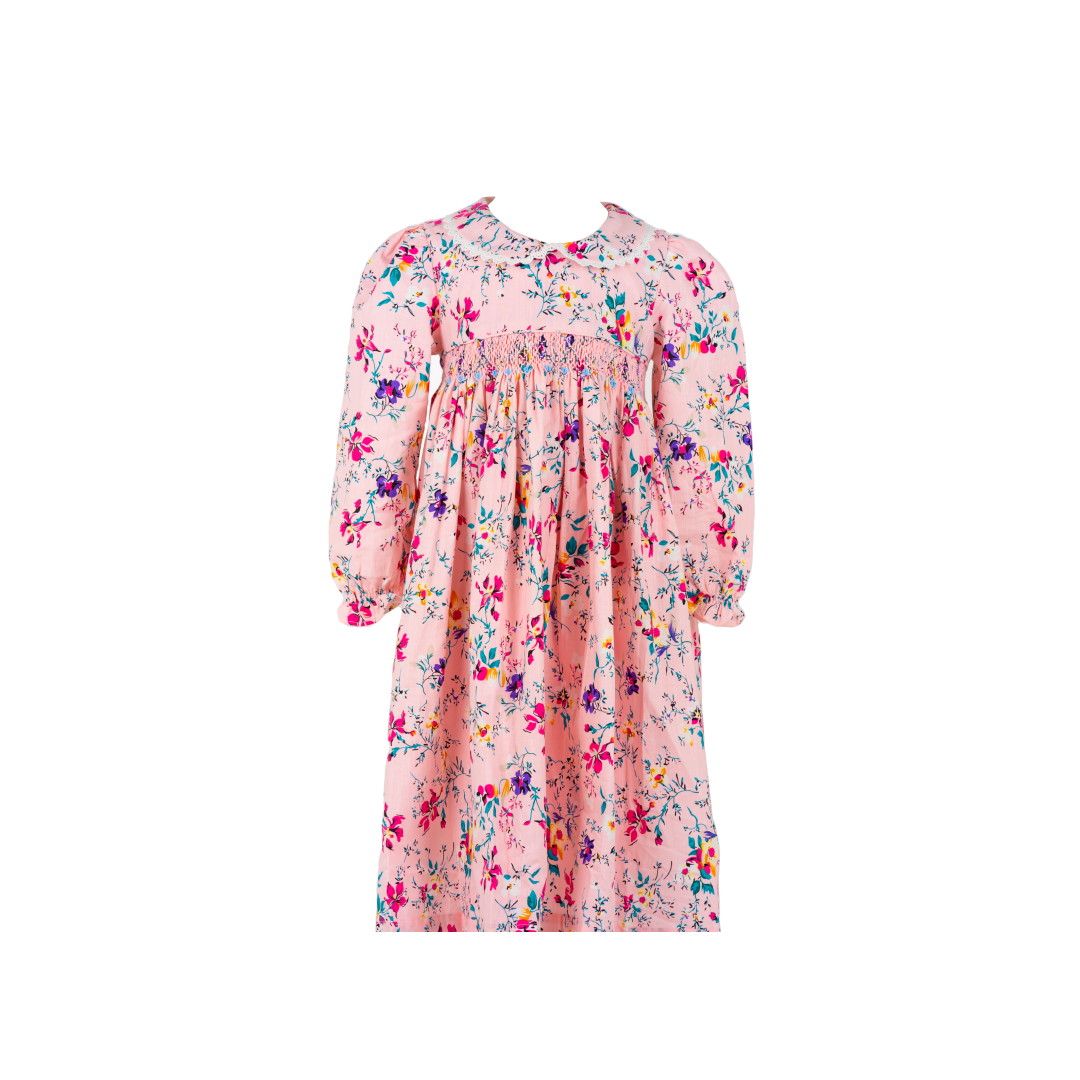 A classic pink dress for little girls, made in a soft and lightweight cotton fabric. The Loxi Dress is fully lined featuring a smocked panel in front, a Peter pan collar with lace trimming details, long sleeves with elastic wrists, and a beautiful floral pattern.