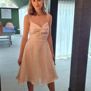 Designed to have a midi A line skirt, making it a perfect choice for ease of movement. It features a sweetheart neckline, adjustable shoulder straps, partially elastic waistline, and a self tie sash at the back.