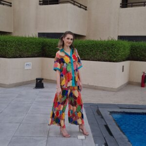 165,00 د.إPerfect outfit for a comfortable day! The fabric is soft and has an airy feel! The top has an elastic waist as well as the bottom shorts. Note that the model is 5’9” hence it looks like a cropped top and she is wearing size S.